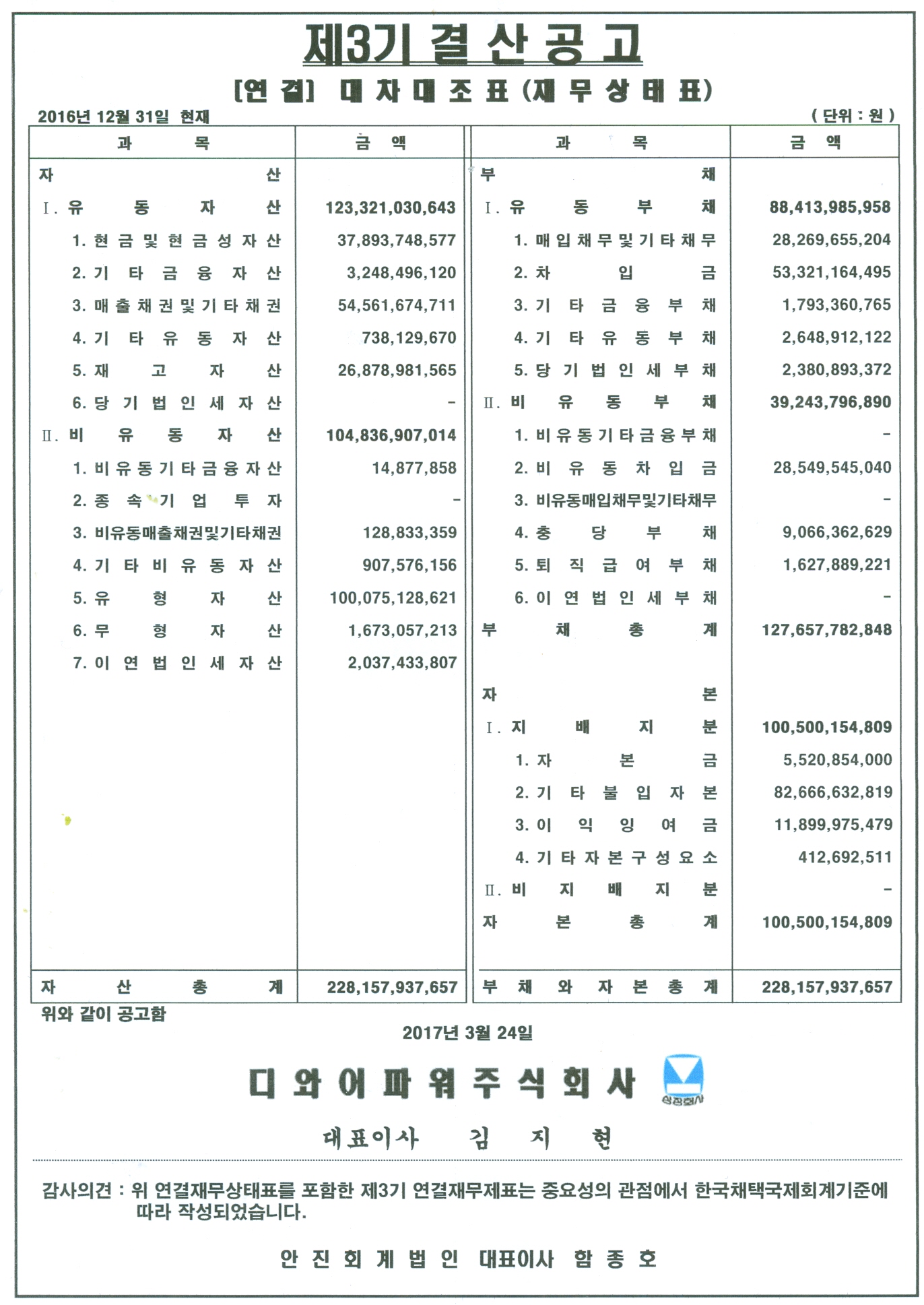제3기 결산대차대조표(별도 및 연결) 공고