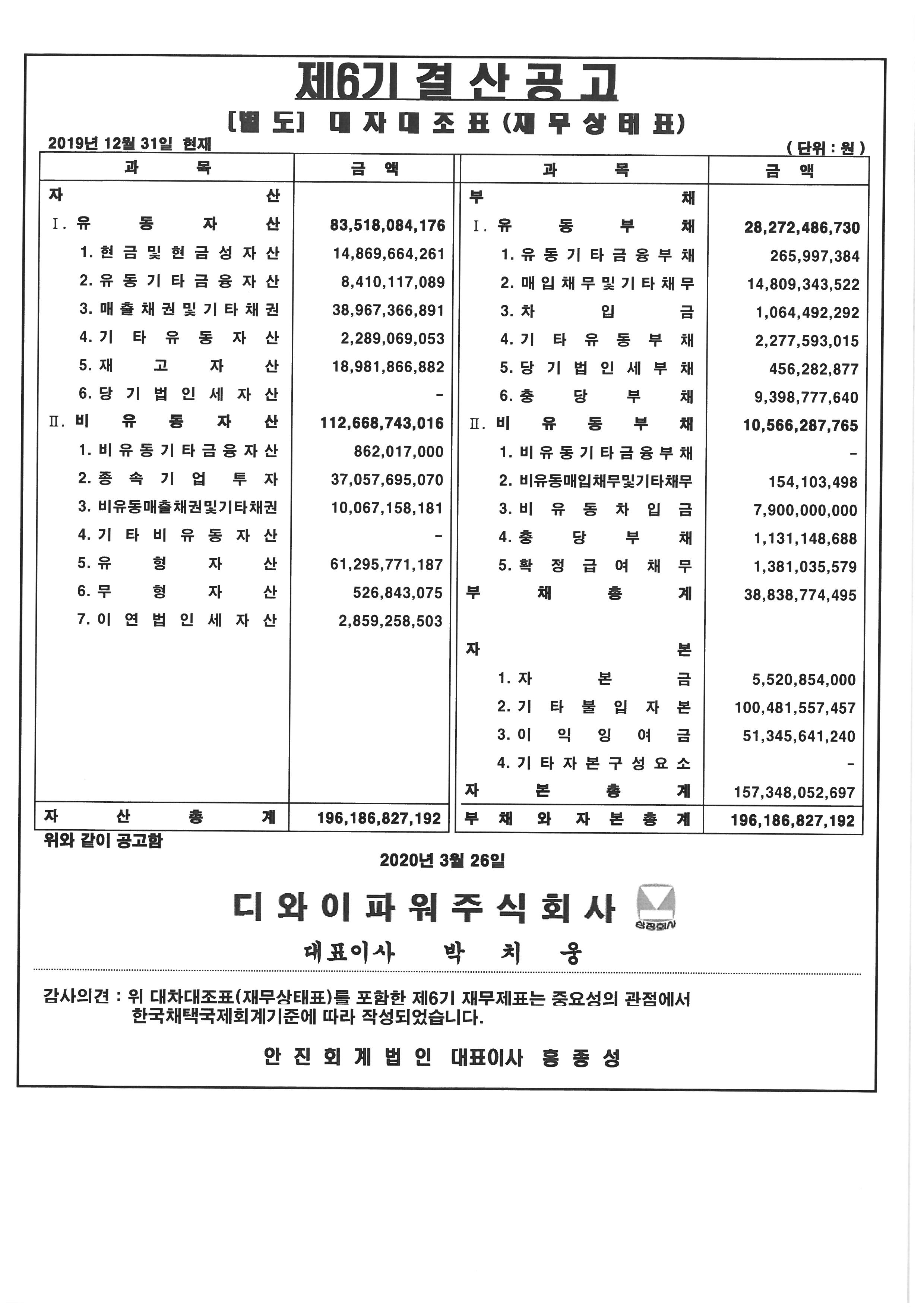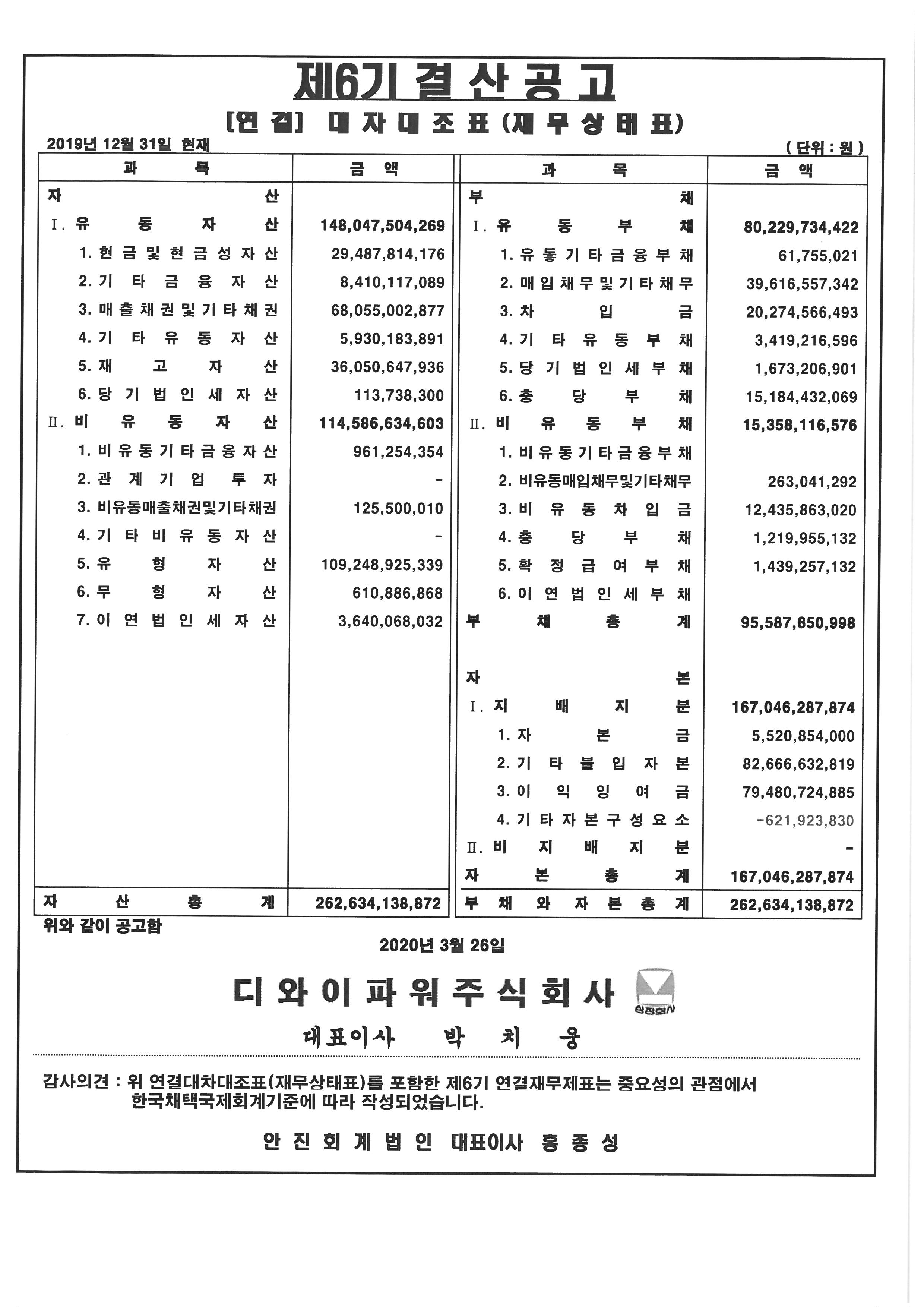 제6기 대차대조표(별도 및 연결) 공고