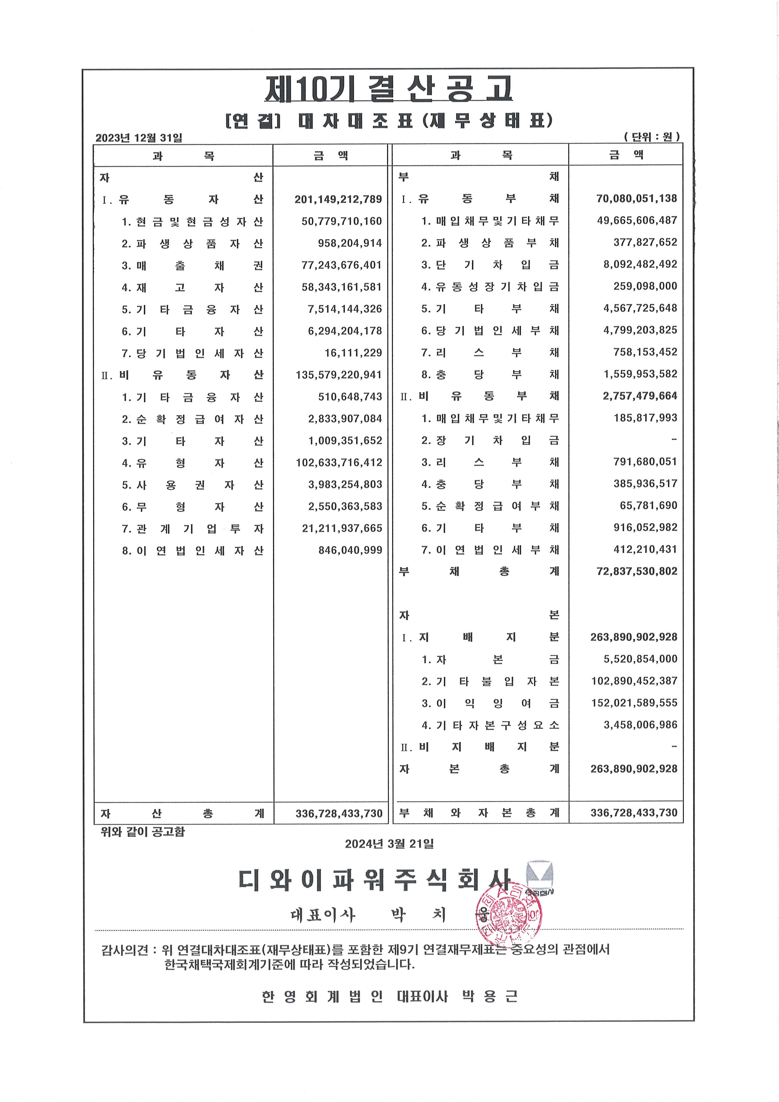 제10기 대차대조표(별도 및 연결) 공고