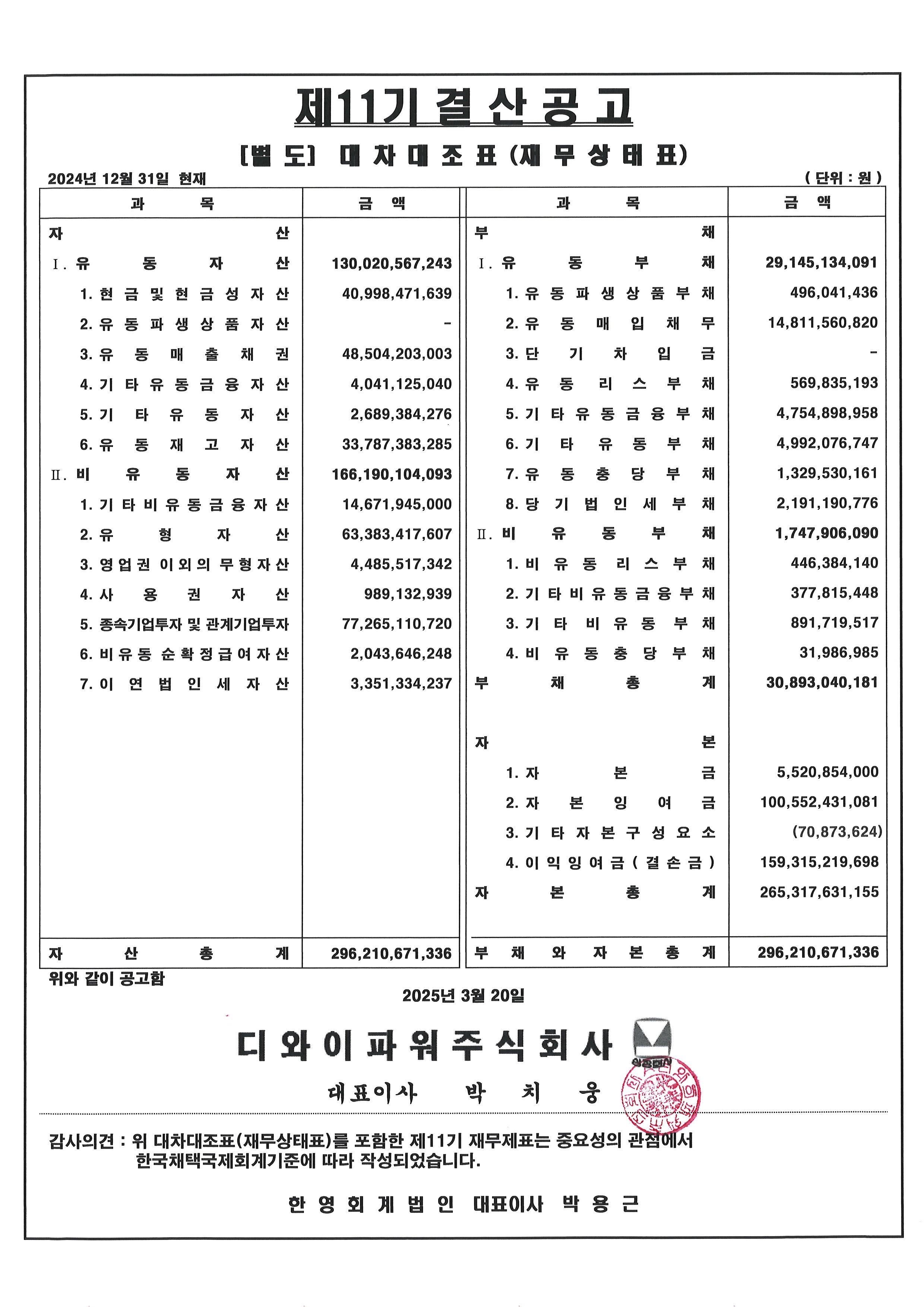 제11기 대차대조표(별도 및 연결) 공고