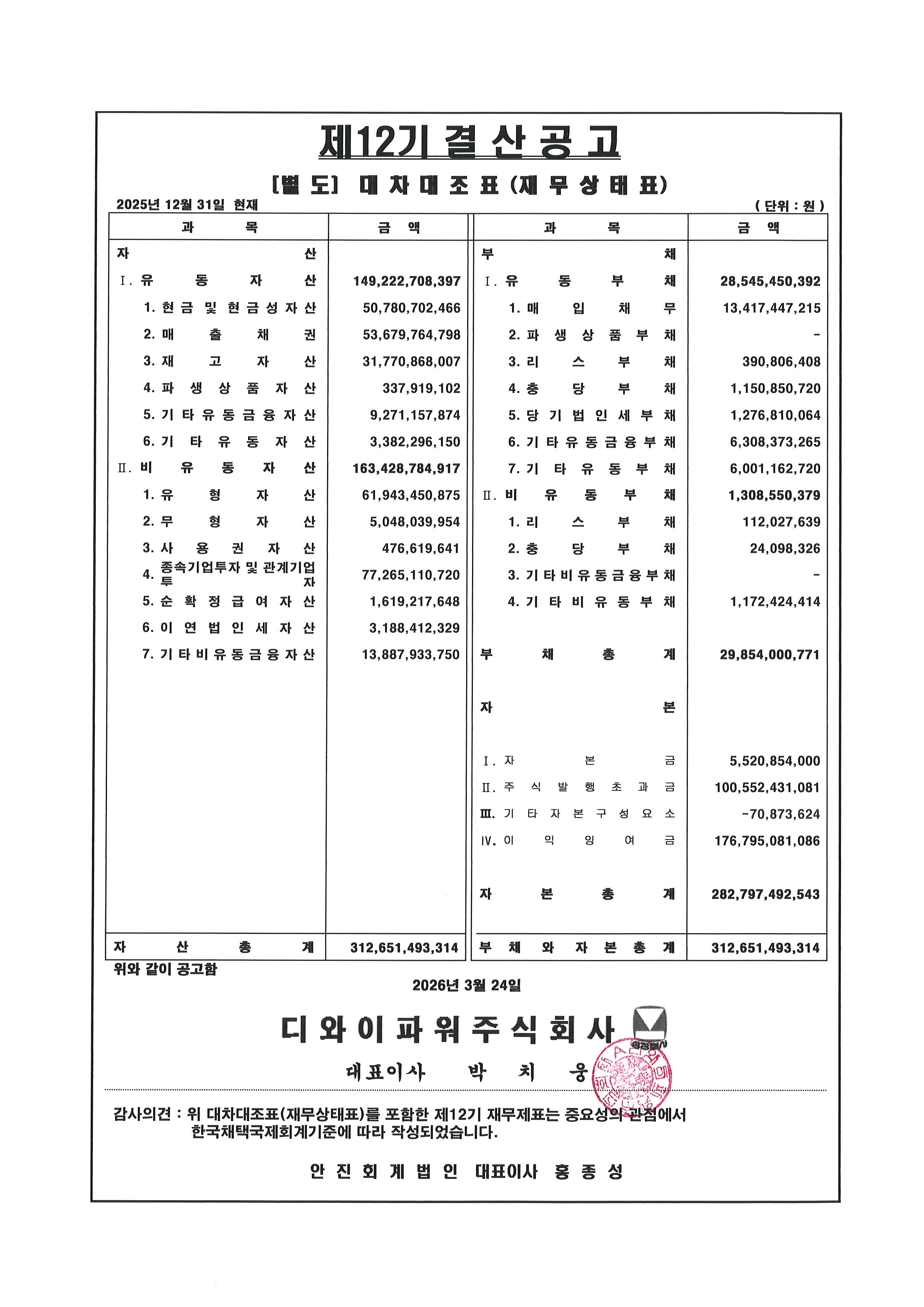 제12기 대차대조표(별도 및 연결) 공고
