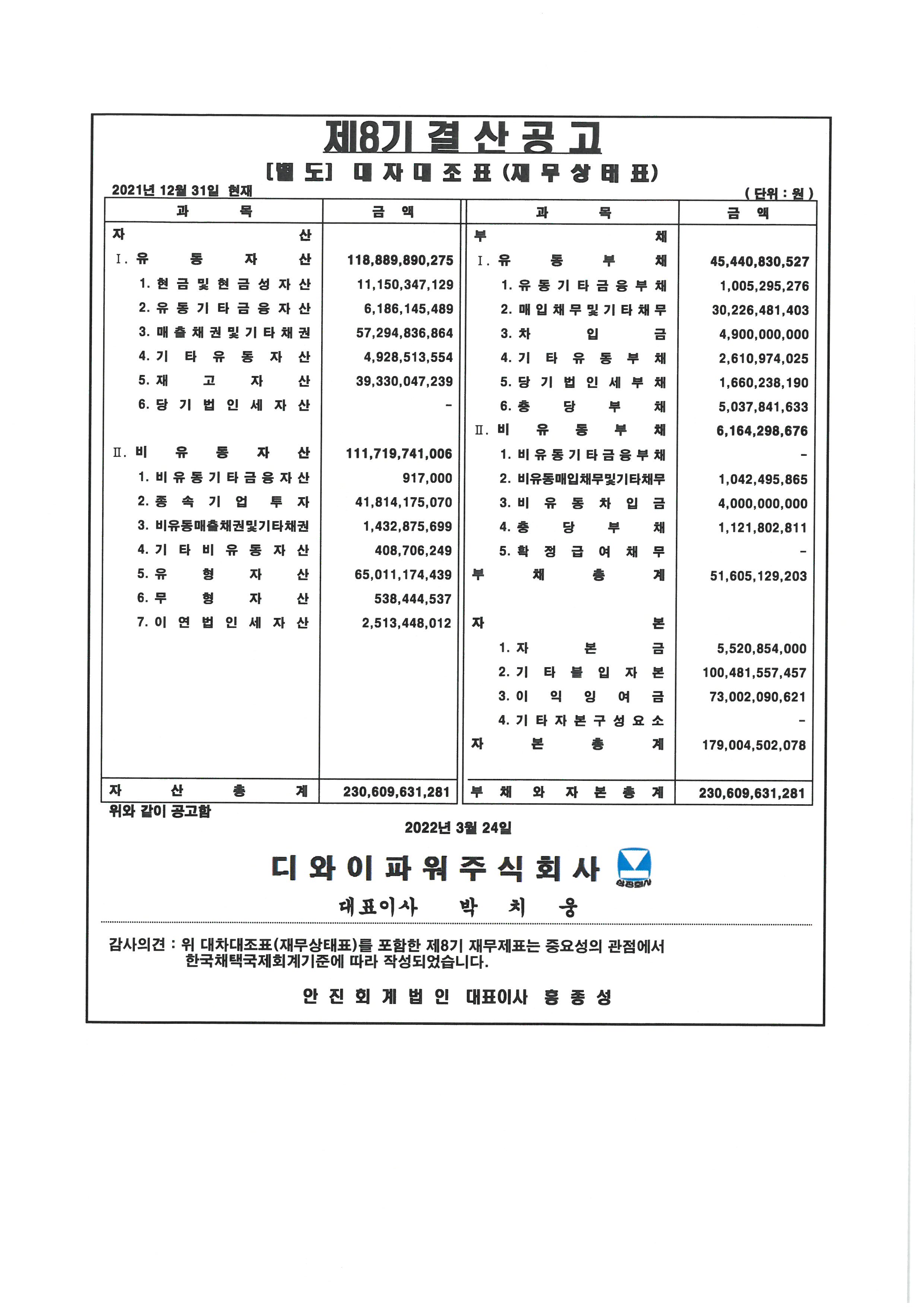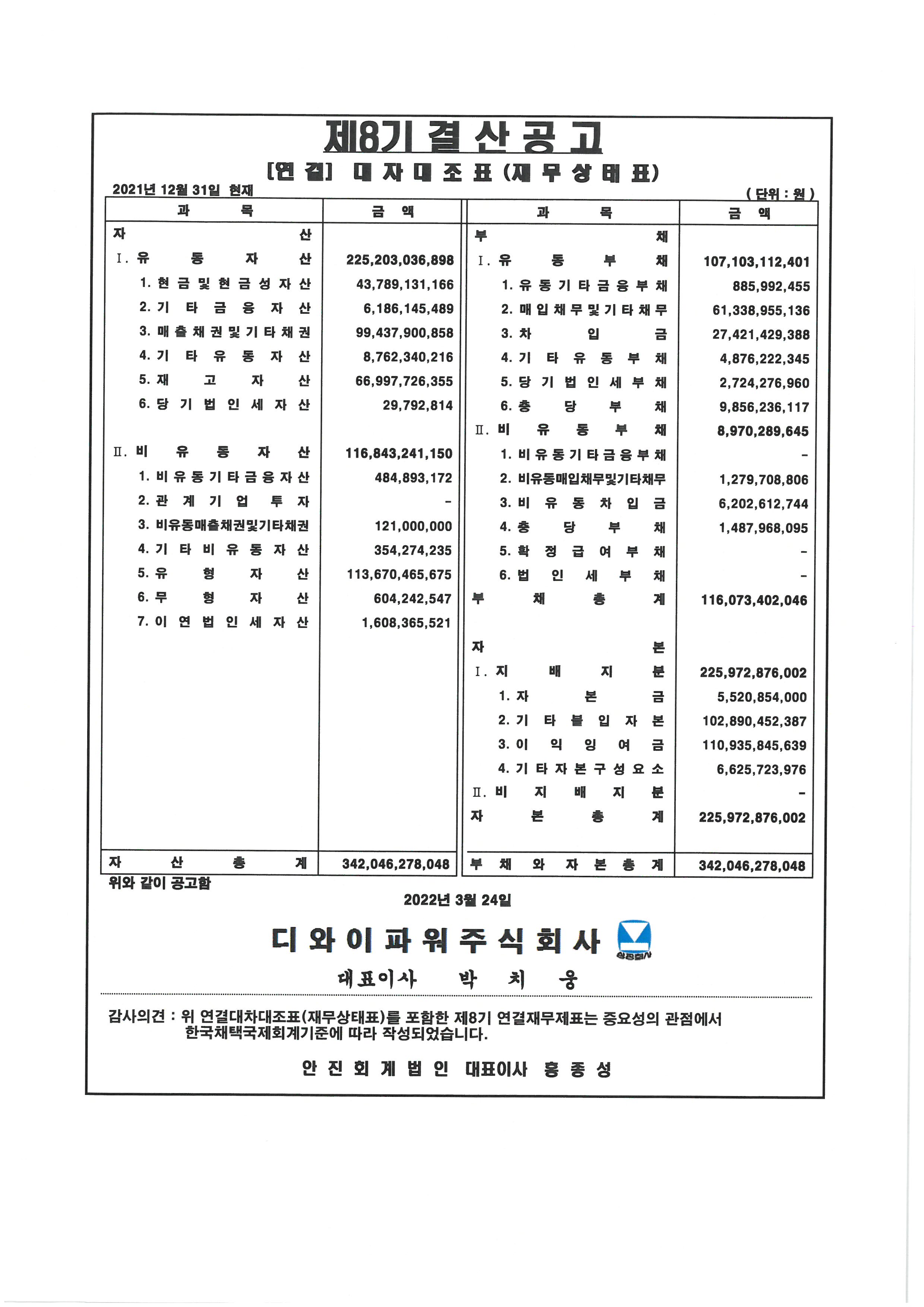 제8기 대차대조표(별도 및 연결) 공고